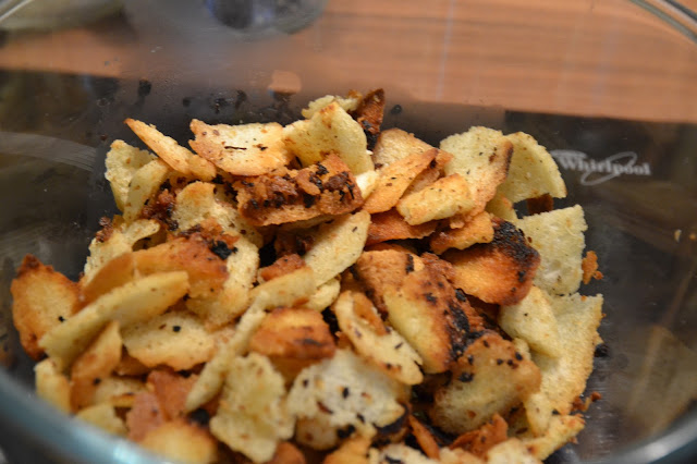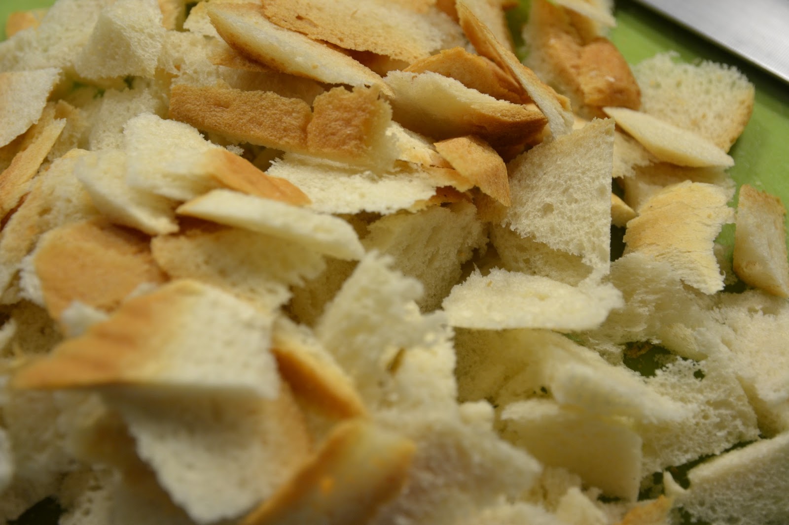 Corta el pan como para hacer unas migas. Es más fácil si el pan es del dia anterior.