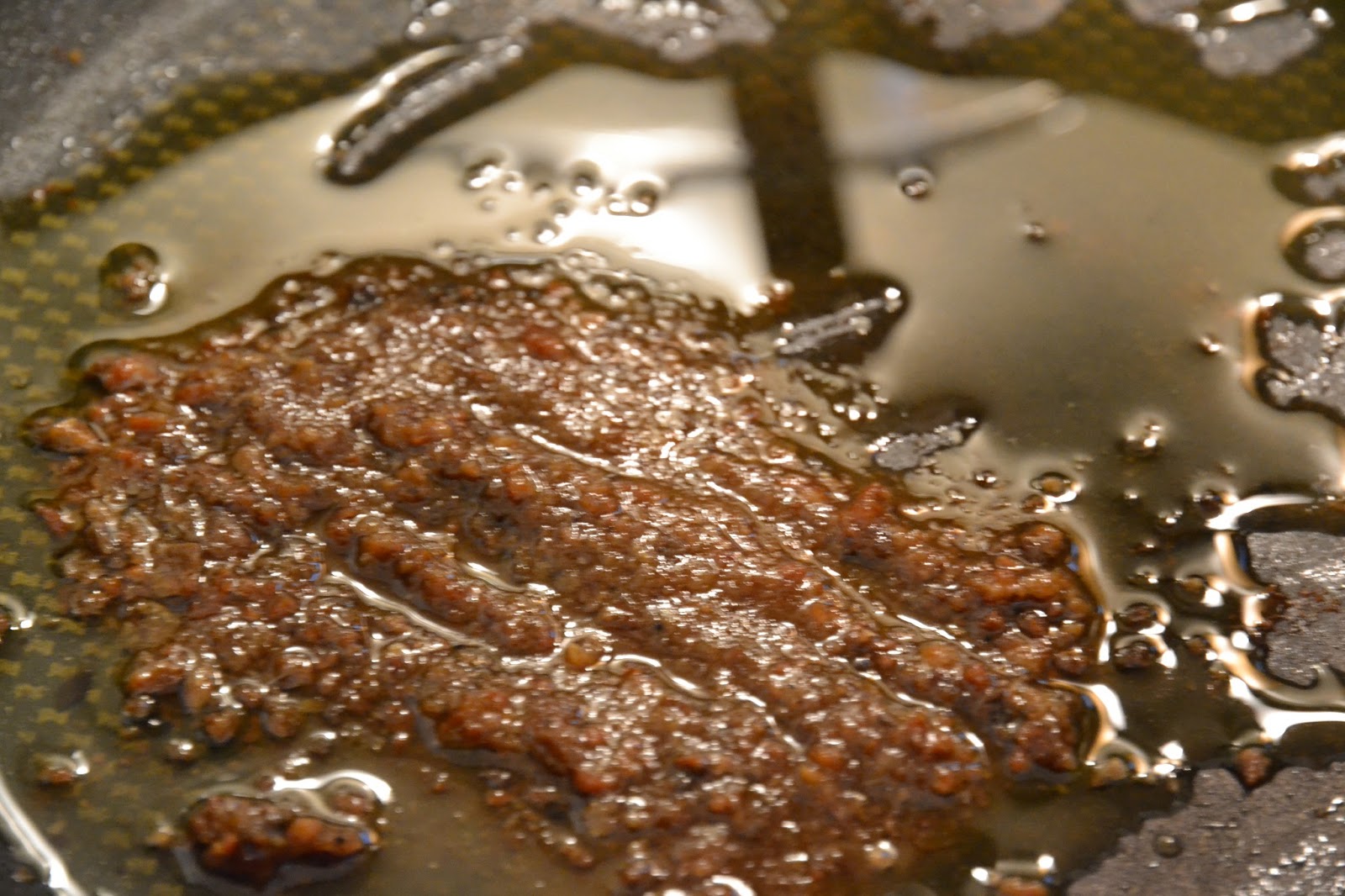 En la misma sartén pon otro poco de aceite con el fuego bajo, añade las anchoas picadas y deja que se hagan 5 minutos.