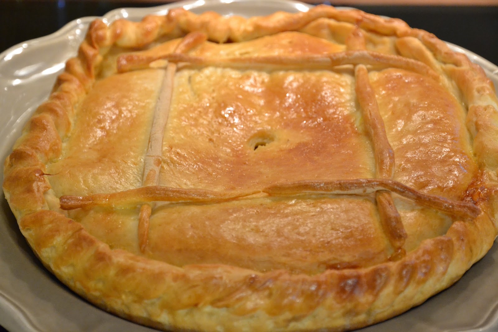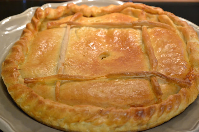Cierra bien todo el borde de la empanada. Decora como quieras, pincha con un palillo toda la tapa y haz una chimenea en el centro. Pinta con huevo batido.
