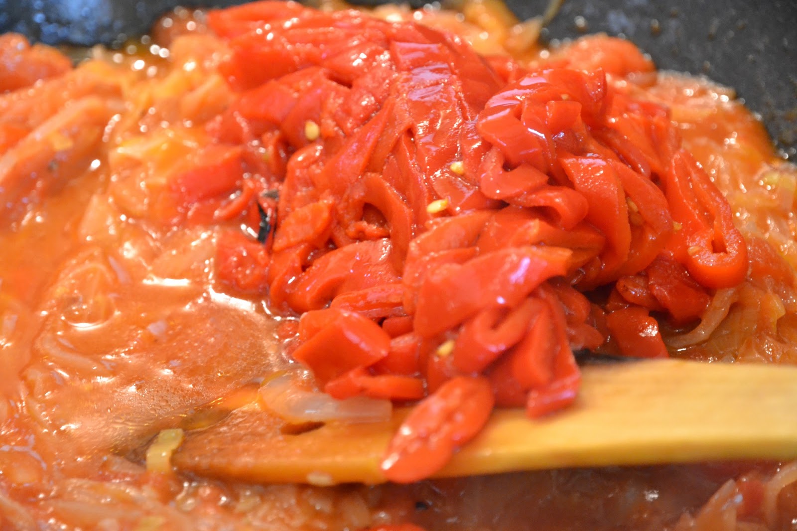 Añade los pimientos cortados en tiras. Fuera del fuego añade el bonito a la mitad de la mezcla. Tiene que estar totalmente fría, con lo que es bueno hacerla de víspera.