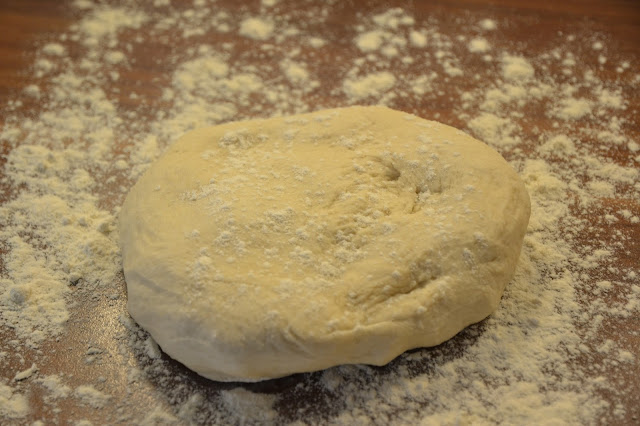 Divide la masa en 2. De la primera mitad coge un poco más de la mitad para la base. Ponlo en la mesa enharinada.