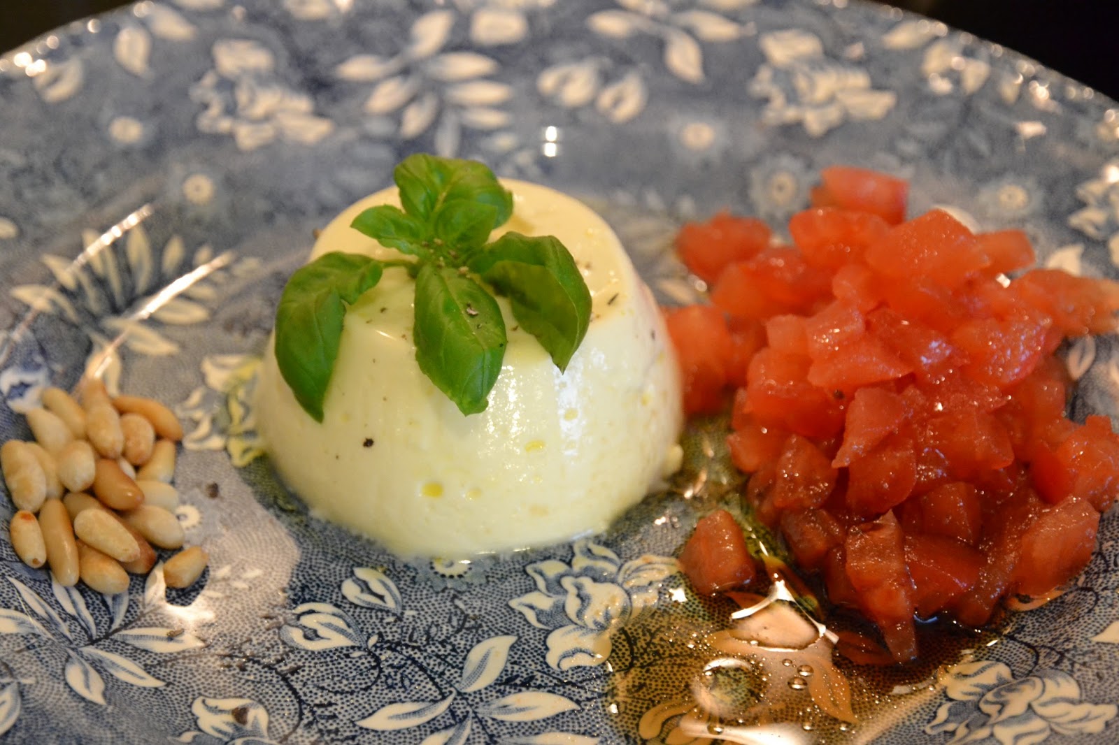 Pasa un cuchillo por los bordes de los moldes y sirve con el tomate picado y aliñado, la albahaca y los piñones tostados en una sartén a fuego medio moviendo para que no se quemen. Puedes poner un chorrito de vinagre balsámico y un poco de pimienta recién molida en cada panna cotta.