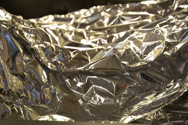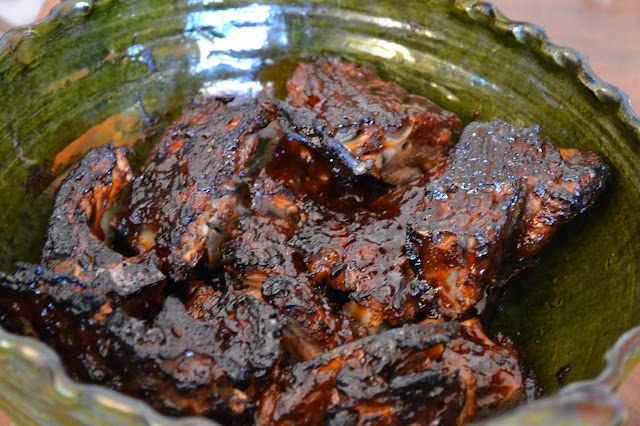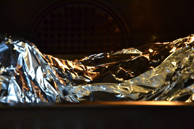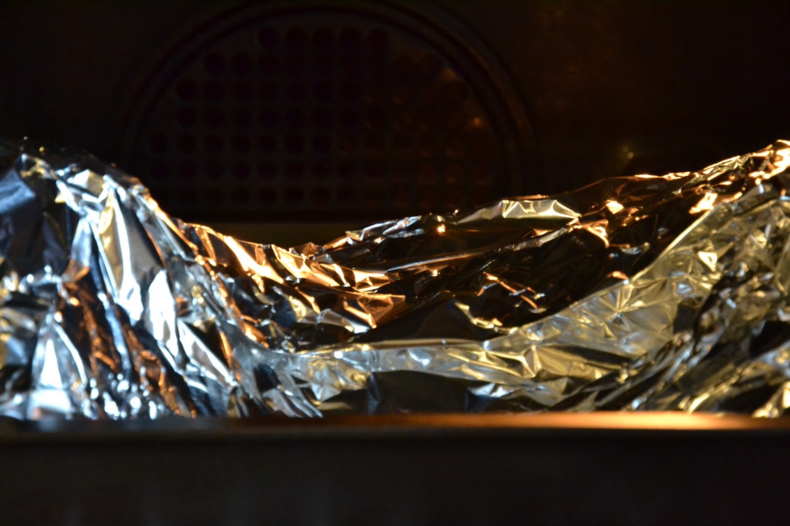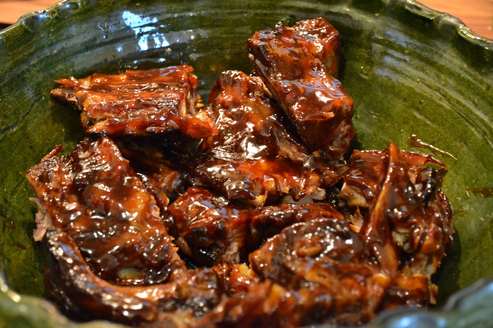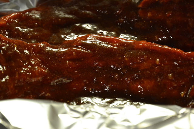 Coloca en una fuente de horno unas tiras de papel de plata. Pon encima las costillas y cúbrelas con la salsa.