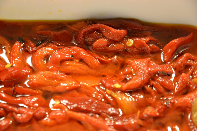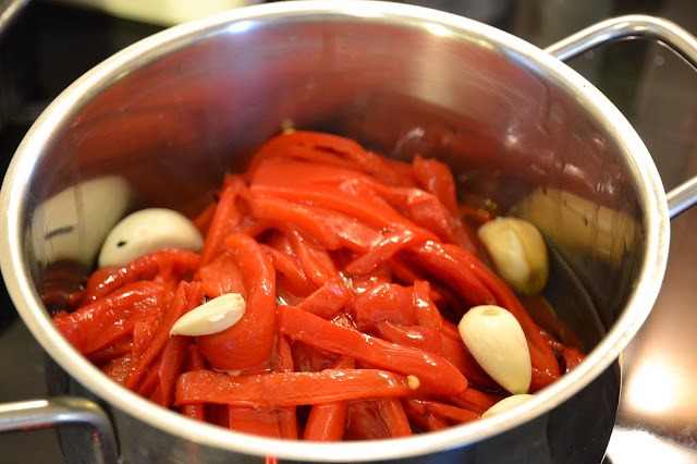 Pimientos rojos asados de lata o frasco (si quieres los puedes comprar frescos, asarlos y pelarlos, a mi, no me compensa. Pueden ser normales o de pico, los que más te gusten, yo a veces los mezclo)